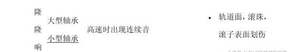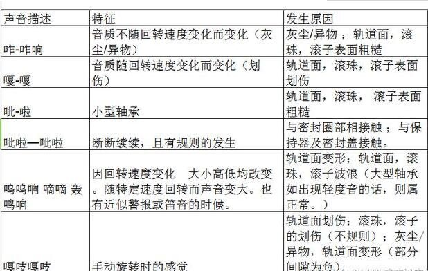 将听诊器贴近法兰盘,调查轴承回转音的大小及音质,如听到清澈音可判断为正常品,但此判断较为复杂,且需要十分丰富的经验。另外,对轴承音用文字进行描述比较困难,且因人而异,判断起来未必准确,这更多是需要经验。以下对轴承的典型异音特征及发生原因作以说明。