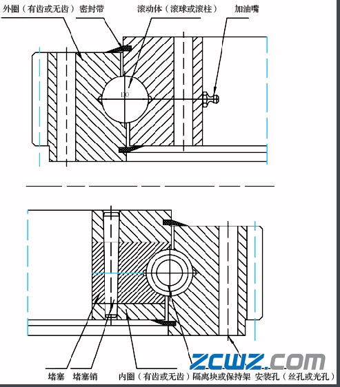 回转轴承也称为转盘轴承,还可以叫回转支承轴承,也有人称这样的轴承为:旋转支承 。总的来说,这种轴承主要由外圈(有齿或无齿)、密封带 、滚动体(滚球或滚柱)、加油嘴、堵塞、堵塞销、内圈(有齿或无齿)、隔离块或保持架和安装孔(丝孔或光孔)几个部位组合而成的。