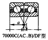 角接触球轴承结构与特性结构简图、代号名称一般特性其他特性 锁口在外圈的单列角接触球轴承1.承载能力较大,额定动载荷比1~1.42.可以同时承受径向载荷和轴向载荷,也可承受纯轴向载荷,接触角越大,轴向承载能力越大3.只能承受一个方向的轴向载荷,在承受径向载荷时,会引起附加轴向力,一般成对使用,使轴向力相平衡4.极限转速高70000Cα= 15°70000ACα= 25°70000Bα= 40° 锁口在内圈的单列角接触球轴承 成对安装的角接触球轴承(串联排列)1.能承受较大的单向轴向载荷,承载能力随接触角的增大而增加2.能限制轴或外壳在一个方向上的轴向位移3.极限转速中用于承受较大的轴向载荷 成对安装的角接触球轴承(背对背排列)1.能承受双向轴向载荷,承载能力随接触角的增大而增加2.通过预紧可限制轴或外壳的轴向位移3.通过预紧可增加轴承的刚度和旋转精度4.极限转速中有较大的抗弯刚支承度,适合于悬臂轴的支承 成对安装的角接触球轴承(面对面排列) 外圈可分离型角接触球轴承1.承载能力较大2.能承受以径向载荷为主的径、轴向联合载荷3.能限制轴和外壳的单向轴向位移4.极限转速高内外圈可分别安装,适用于安装条件受限制的部位,一般成对使用 内圈可分离型角接触球轴承 双列角接触球轴承1.承载能力大2.能承受双向轴向载荷,还可以承受一定的倾覆力矩3.具有成对安装的背对背轴承的特点,但宽度较窄4.极限转速高接触角α=30°,刚度较好回到顶部
