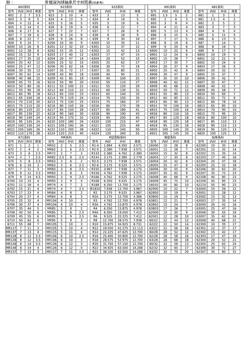 常规深沟球轴承型号尺寸对照表