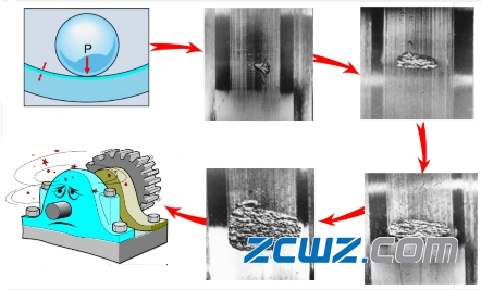 滚动体和内圈(或外圈)不断地转动,滚动体与滚道接触表面受变应力作用。当应力循环次数达到某一数值时, 在滚动体或滚道的工作面上就产生麻点和凹坑。如图所示。