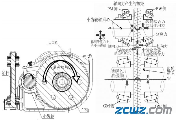 为了更好的找出齿轮箱轴承损坏的原因,首先我们要了解下,传动齿轮箱的结构。齿轮箱主要组成部件包括齿轮箱箱体、密封件、轴承、齿轮、轴承座、接地装置及吊杆。大齿轮压装在车轴上,大齿轮轴承通过大齿轮轴承盖与齿轮箱体和车轴连接,确保车轴、大齿轮和齿轮箱体相对转动。小齿轮轴通过轴承、轴承盖安装在齿轮箱体中,小齿轮与大齿轮啮合传递动力。齿轮箱吊杆与构架连接。小齿轮轴伸出端通过联轴节与牵引电机实现柔性连接,将牵引电机的动力传递到车轴上,带动车辆运行。齿轮箱内部结构如图 2 所示。