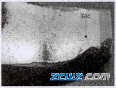 4、如图5所示,在圆柱滚子轴承套圈内表面也发现多处磨损沟槽及剥落块,还有宏观可见的裂纹。这说明轴承套圈与轴有相对的滑动摩擦。按照轴承的工作原理,轴承套圈应与轴过盈配合,轴转动时,轴承套圈与轴一起转动,滚柱在轴承套圈与外圈之间滚动,以减少轴的震动。如果轴与轴承套圈之间的间隙过大,轴与轴承套圈出现相对滑动摩擦,会造成滚柱不能正常滚动,套圈直接承受很大的接触应力,轴承超载工作,导致疲劳点蚀和疲劳脱落。